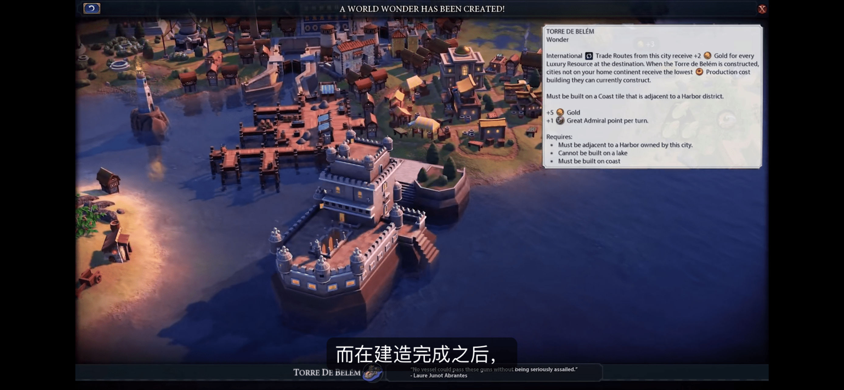 。 这句话真的绕 🤣。需要与港口区域相邻。 - 当奇观建成时,所有非首都所在大陆的城市直接获得一个最低